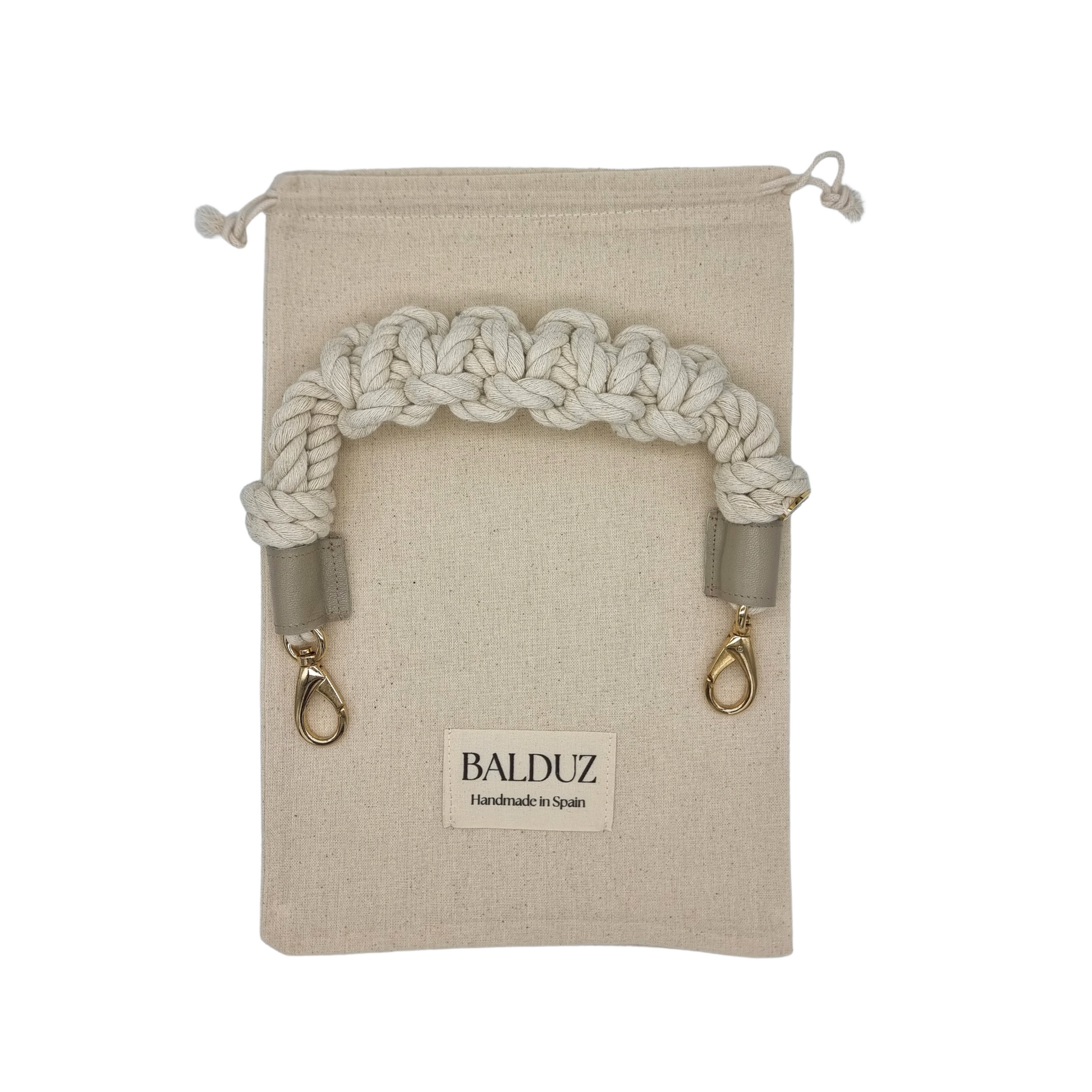 Hecha a mano con cordón 100% algodón, sus extremos de retales de piel de Ubrique y mosquetones fabricados en Alicante garantizan calidad y durabilidad.