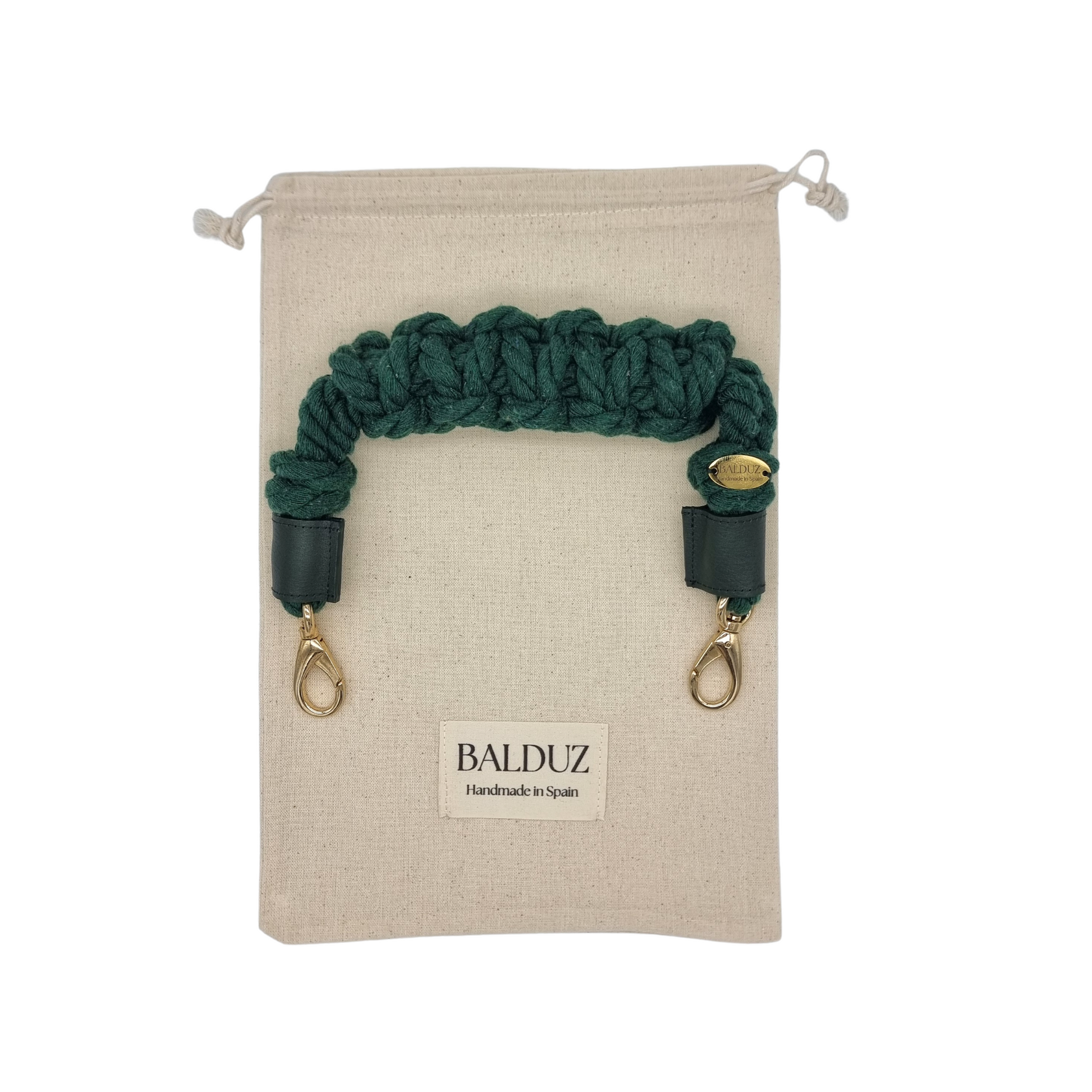 Hecha a mano con cordón 100% algodón, sus extremos de retales de piel de Ubrique y mosquetones fabricados en Alicante garantizan calidad y durabilidad.