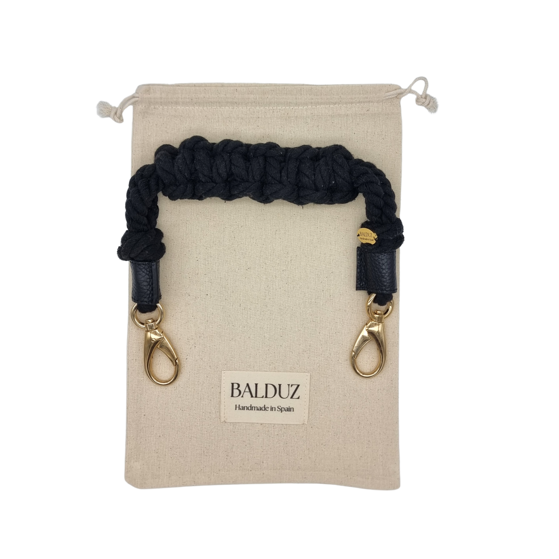 Hecha a mano con cordón 100% algodón, sus extremos de retales de piel de Ubrique y mosquetones fabricados en Alicante garantizan calidad y durabilidad.