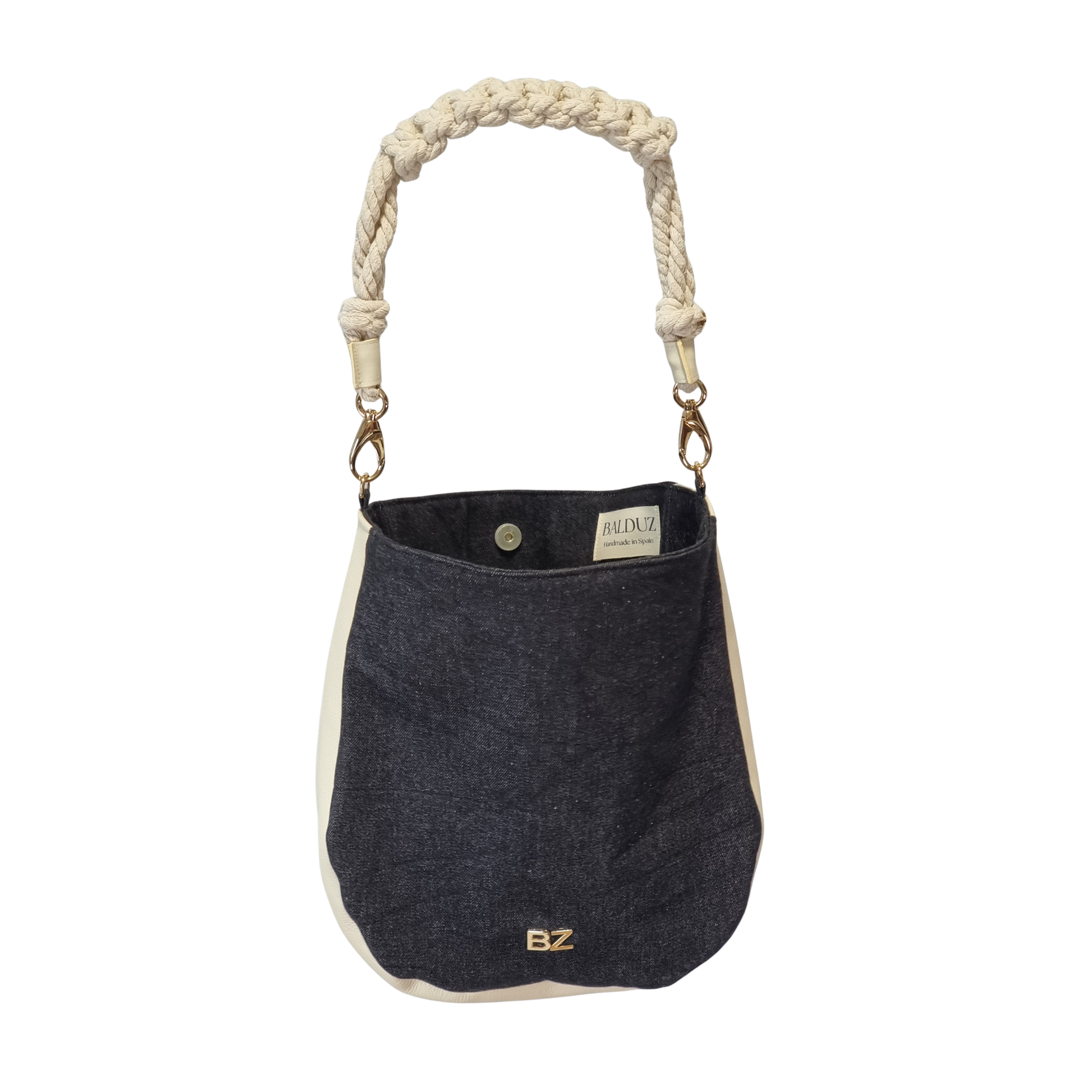 Combinable con tres tipos de asas: denim (incluida), macramé y algodón (no incluidas).