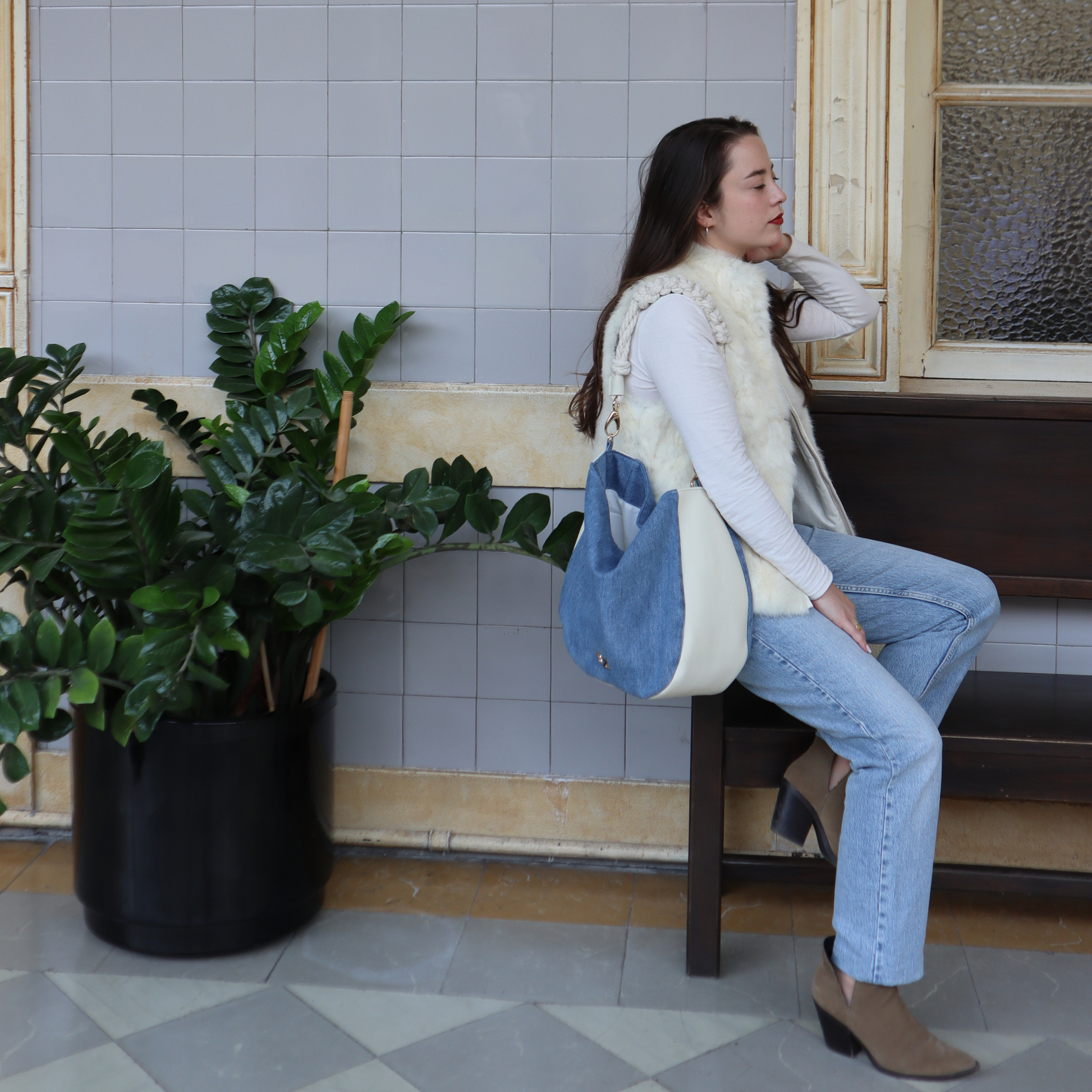 Transforma tu estilo con este bolso hecho a mano en España con denim reutilizado y retales de piel en color beige. Su diseño flexible y versátil lo hace perfecto para cualquier ocasión, mientras que su elegancia y exclusividad te harán destacar en cualquier lugar.
