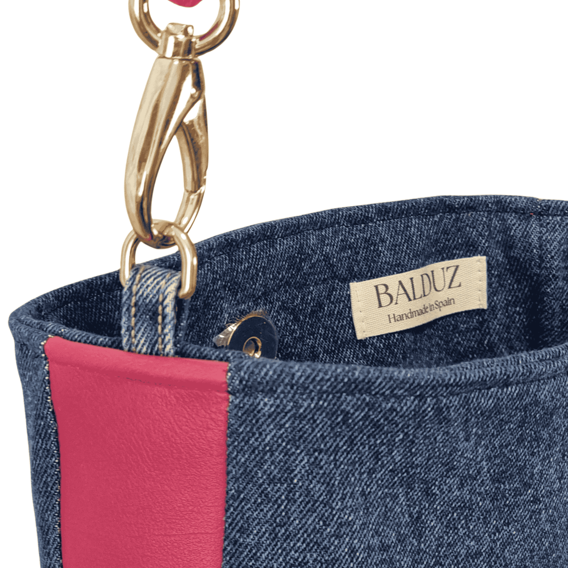 Transforma tu estilo con este bolso hecho a mano en España con denim reutilizado y retales de piel en color fucsia. Su diseño flexible y versátil lo hace perfecto para cualquier ocasión, mientras que su elegancia y exclusividad te harán destacar en cualquier lugar.