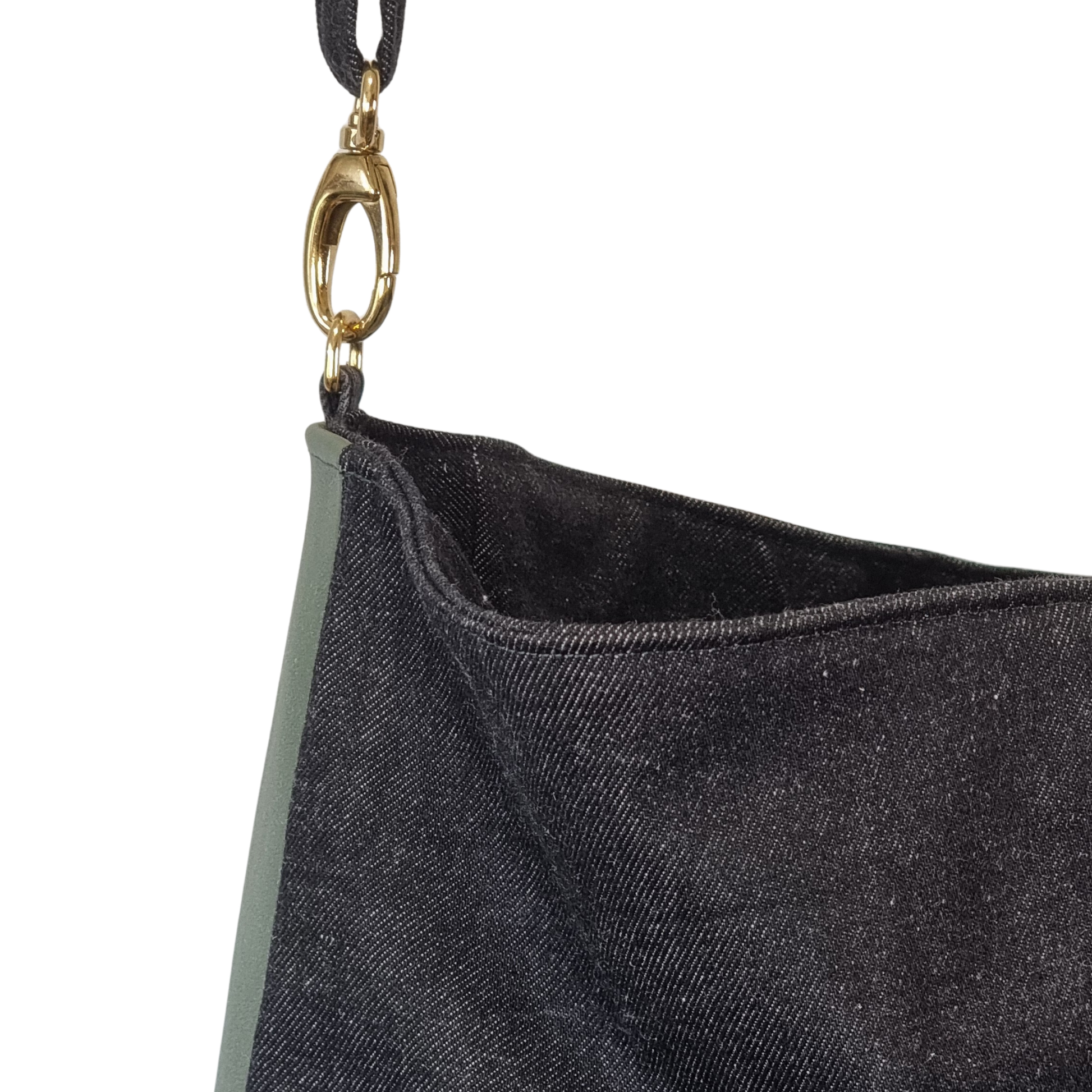 Transforma tu estilo con este bolso hecho a mano en España con denim reutilizado y retales de piel en color verde oscuro. Su diseño flexible y versátil lo hace perfecto para cualquier ocasión, mientras que su elegancia y exclusividad te harán destacar en cualquier lugar.