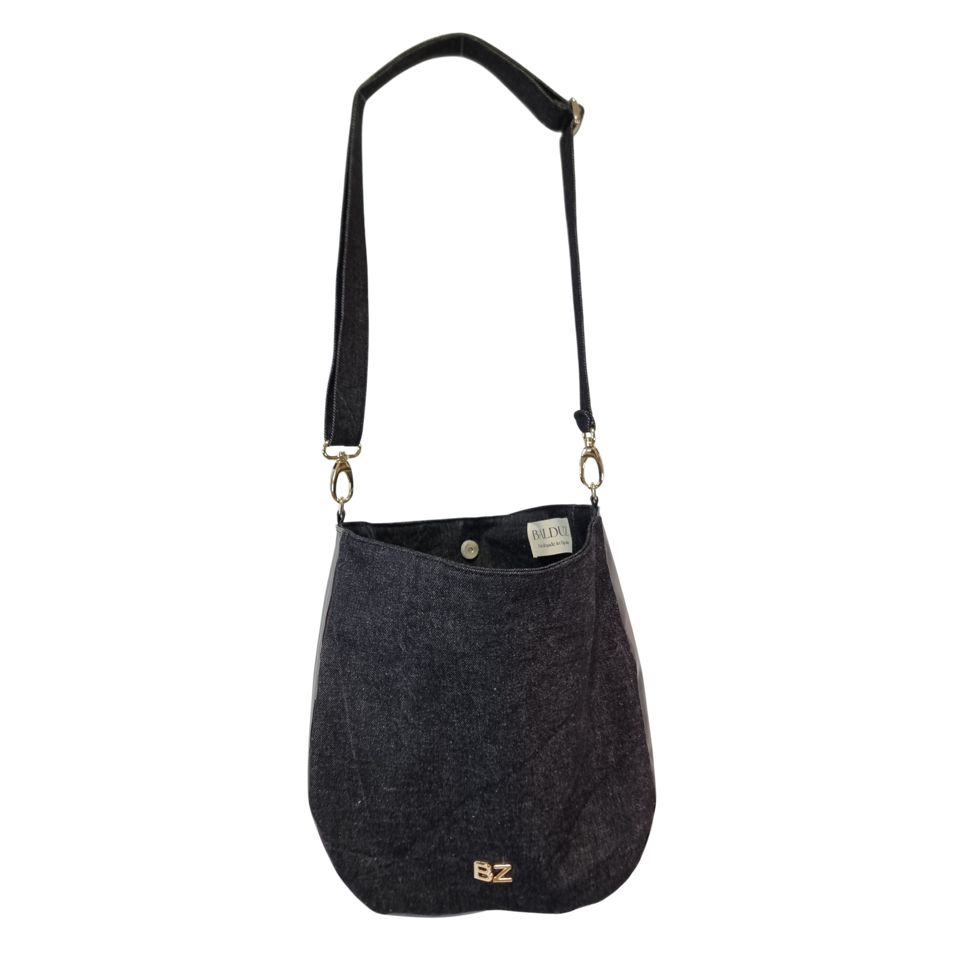 Transforma tu estilo con este bolso hecho a mano en España con denim reutilizado y retales de piel en color negro. Su diseño flexible y versátil lo hace perfecto para cualquier ocasión, mientras que su elegancia y exclusividad te harán destacar en cualquier lugar.